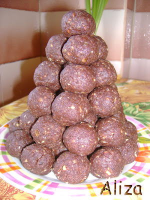 Ingrediente: 4 cani biscuiti simpli sfaramati, 3 cani nuca macinata, 1 cana zahar, 3 linguri cacao, 1 cana lapte, visine din visinata scurse bine.