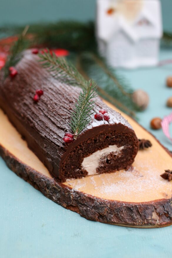 Aceasta prajitura festiva, care este o rulada sub forma de bustean ( Bûche de Noël ) si este umpluta cu o crema de frisca si castane, iar deasupra cu o crema densa de ciocolata. Un desert clasic european de sarbatori! Merge perfect alaturi de un pahar de sampanie!