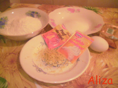 Ingrediente: 250 g faina,1 lingurita rasa praf de copt, 75 g zahar, 1 plic de vanilie, coaja de la o lamaie,1 ou, 125 g unt sau margarina.