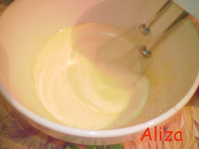 Oul se bate cu zaharul, zaharul vanilat si coaja de lamaie pana devine spuma.