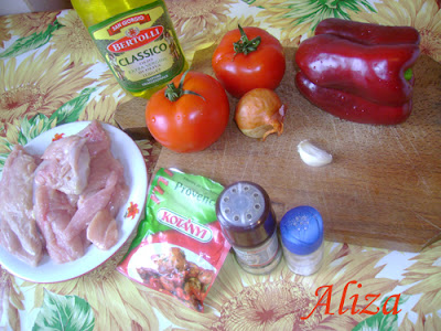 Pieptul de pui se taie, se sareaza si pipereaza, se pune intr-o tava unsa cu ulei de masline si se da la cuptor pentru 15 minute.