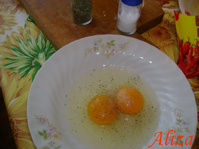 Separat se bat cele doua oua cu sare si piper.