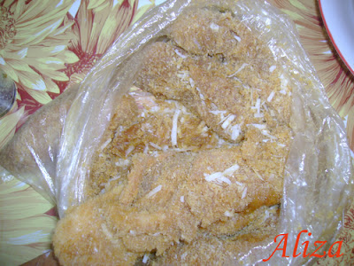 Se pun intr-o punga, se adauga bucatile de pui si se amesteca bine.